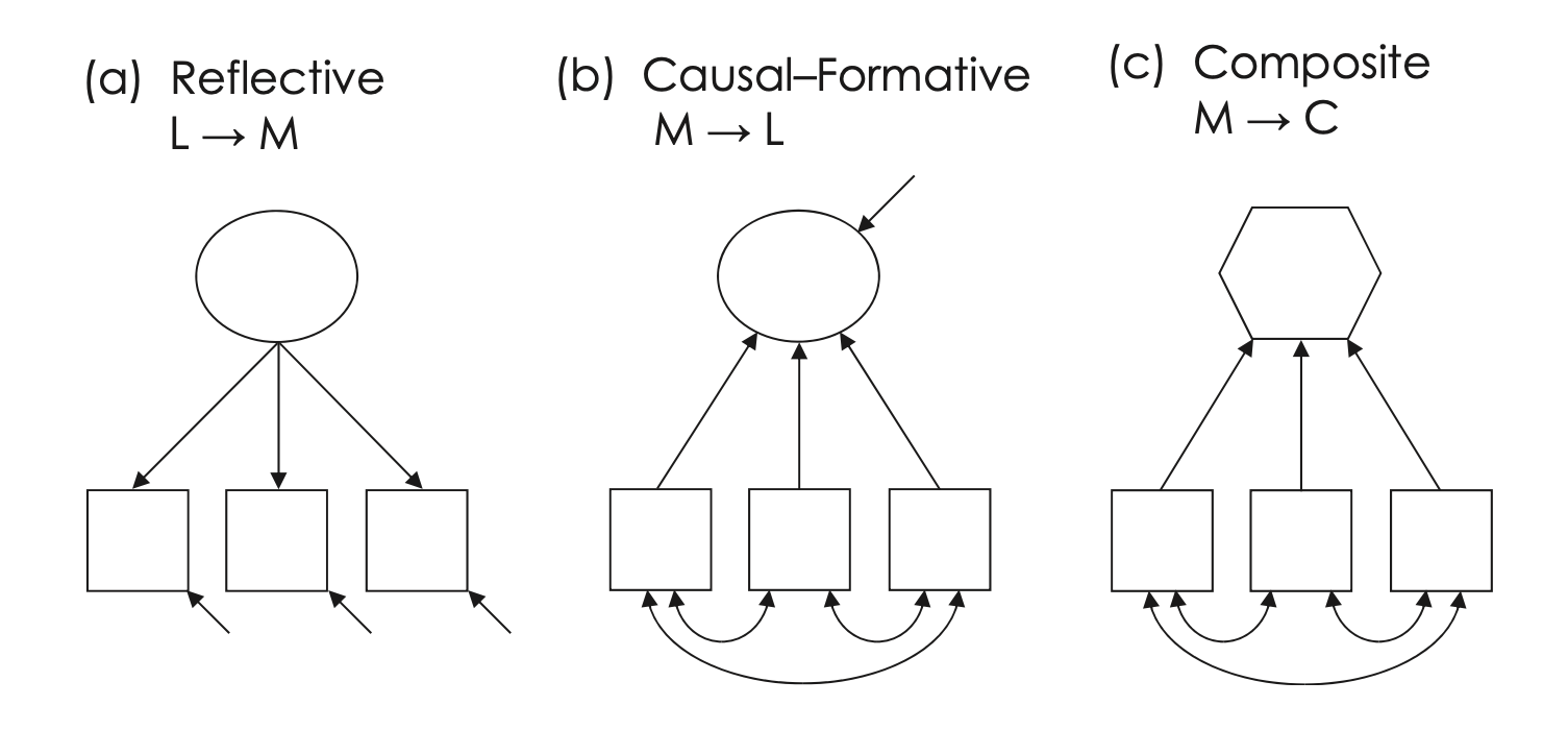 FIGURE 13.2. Measurement models for a set of three indicators: reflective measurement with effect indicators (a), causal–for‑ mative measurement with causal indicators (b), and composite (composite–formative) measurement with composite indicators (c). L, latent; M, manifest; C, composite.