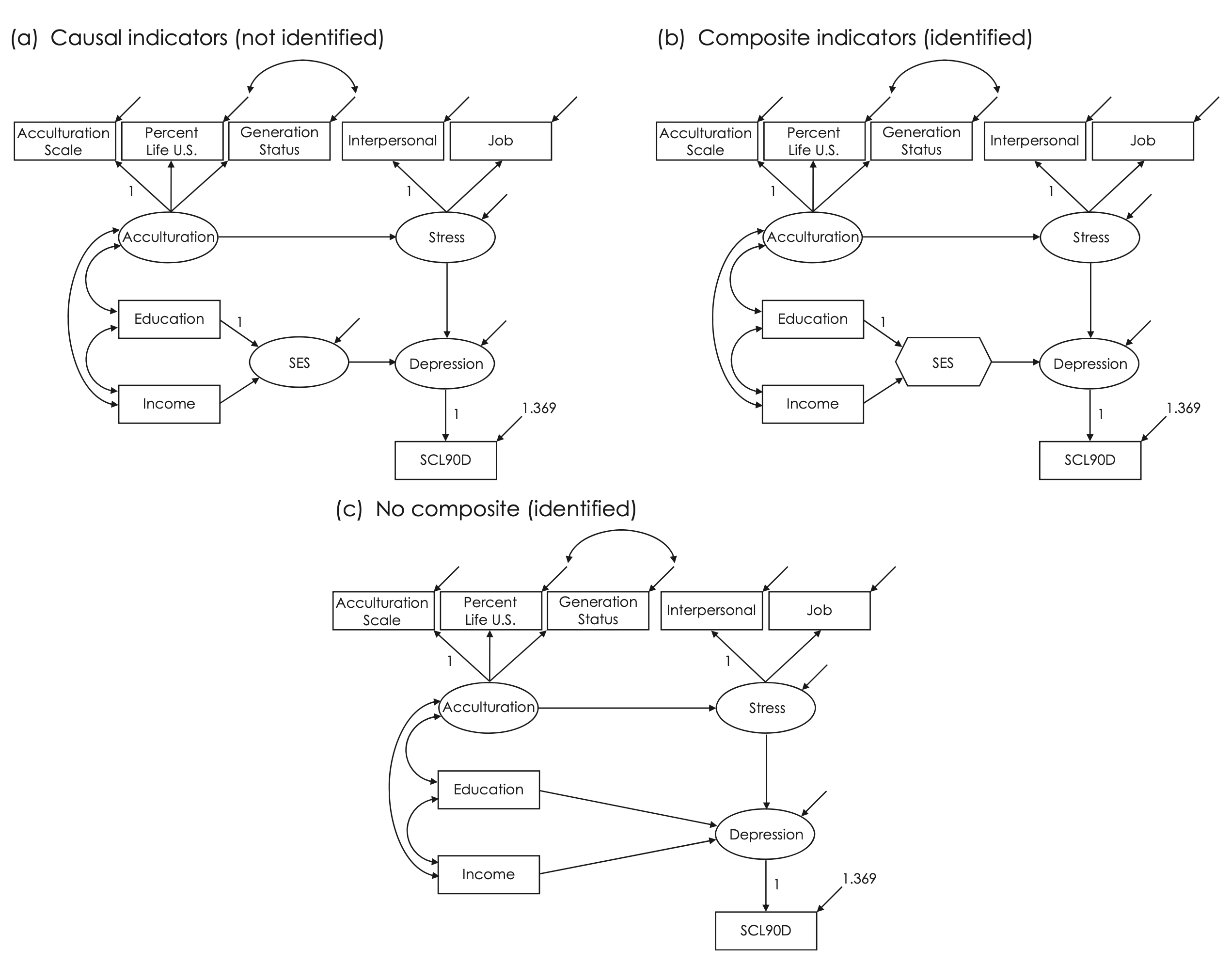 library(manymome)FIGURE 16.2. Structural regression models with causal indicators for a latent socioeconomic status composite with a disturbance (a). Zero‐error variance model with composite indicators for an SES composite with no disturbance (b). A partially reduced form model with no SES composite (c). Model (a) is not identified, models (b) and (c) are equivalent. (p. 292)