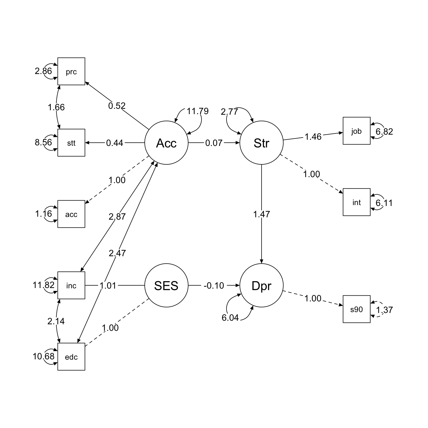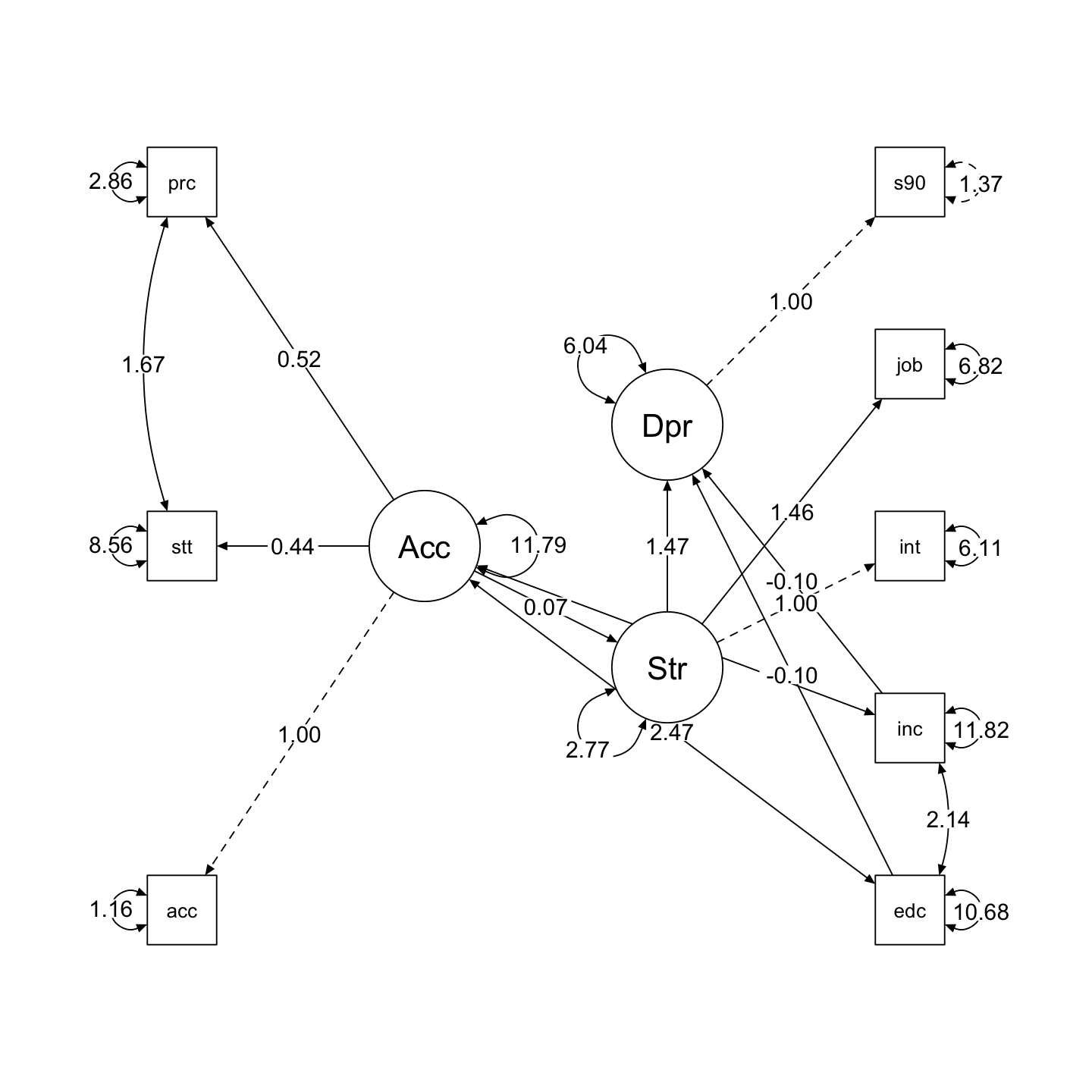 semPlot::semPaths(model, what = what, edge.label.cex = 1, edge.color = "black", layout = layout, rotation = rotation, weighted = FALSE, asize = 2, label.cex = 1, node.width = 1.2)