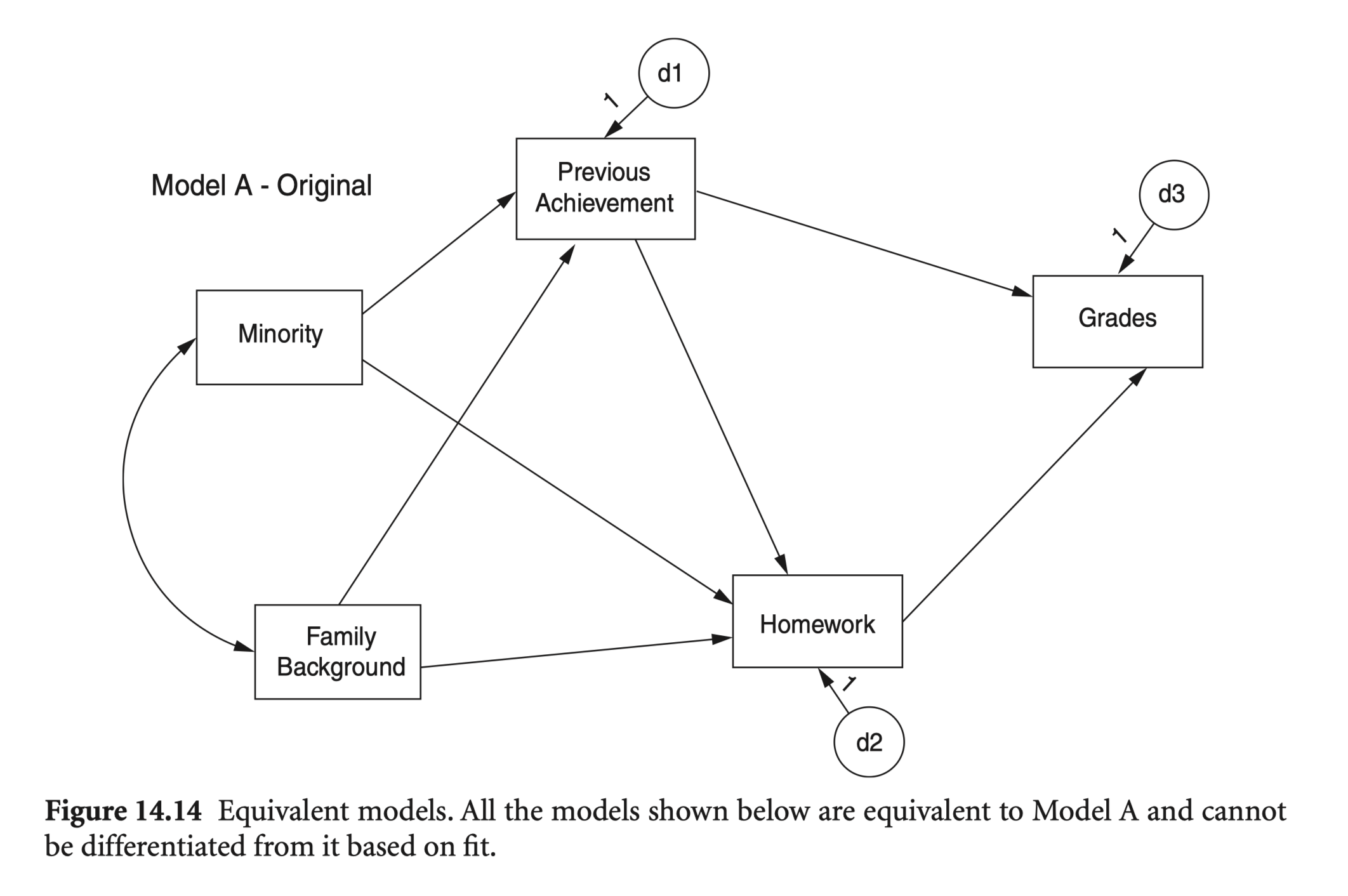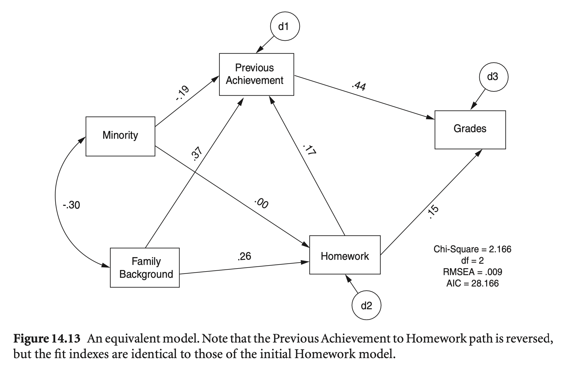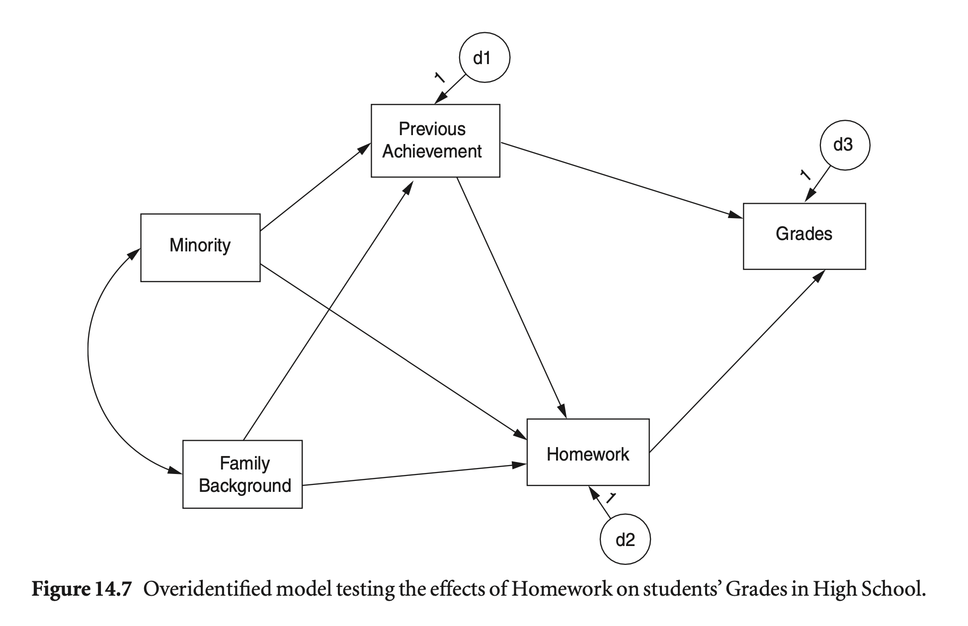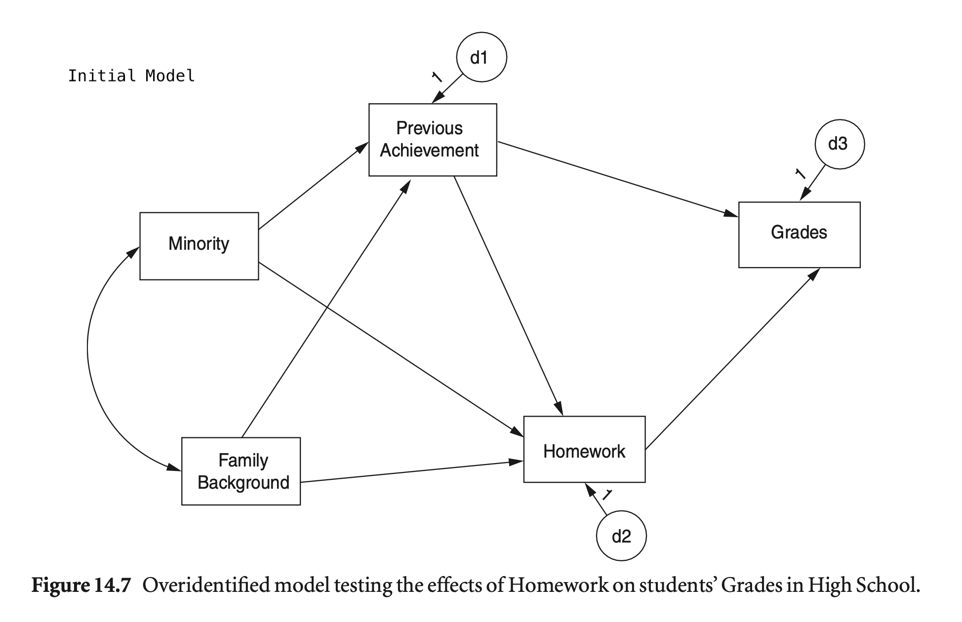 여기서는 자유도가 0인 포화모형을 우선 고려한 후, 이후 더 단순한 모형을 고려할 것임. 자유도가 0이면 모형의 적합도는 의미가 없으며, 이 경우를 포화모형(saturated model)이라고 함.