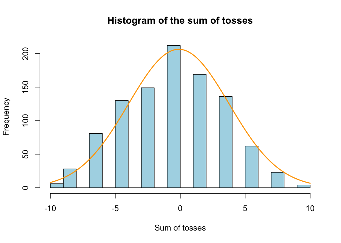 예를 들어, 1000명의 사람들이 각자 16번의 동전 던지기를 시행하면서 좌우로 움직인다면,