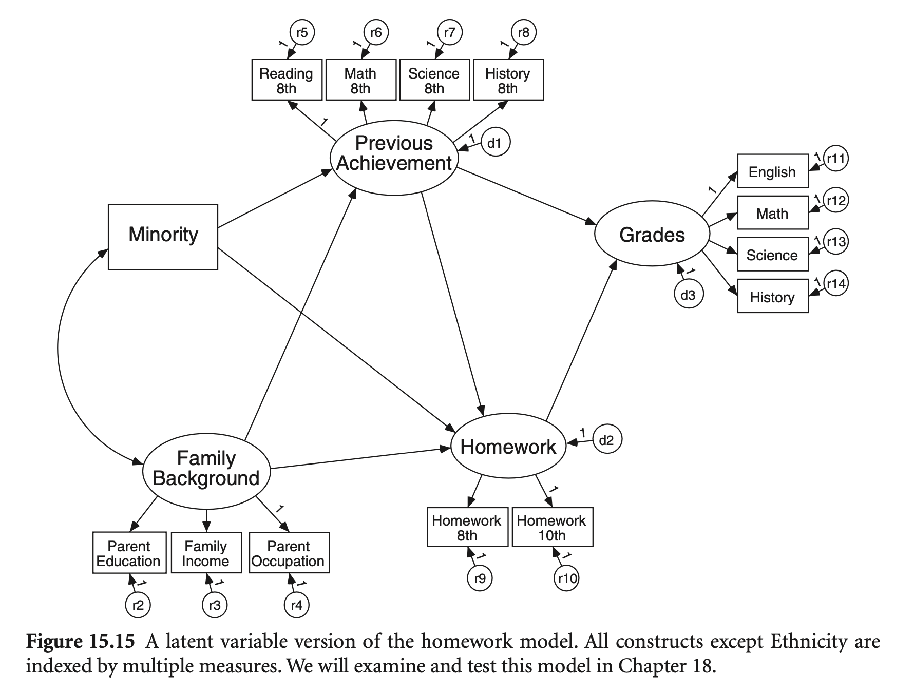 앞서 살펴본 homework와 grade의 관계에 대한 모형을 잠재변수를 통해 살펴보면,