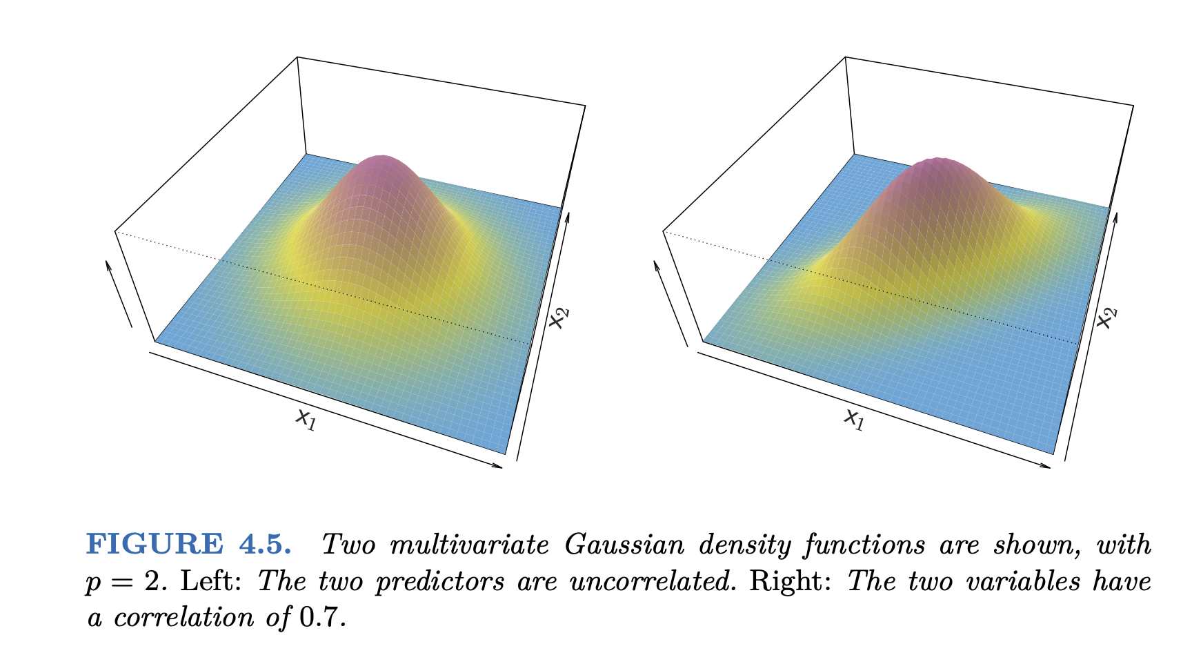 Multivariate Gaussian 분포: \(\displaystyle f(\mathbf{x}) = \frac{1}{(2\pi)^{p/2}|\Sigma|^{1/2}} \exp\left(-\frac{1}{2}(\mathbf{x}-\mu)^T\Sigma^{-1}(\mathbf{x}-\mu)\right)\)