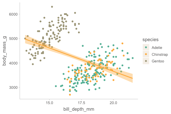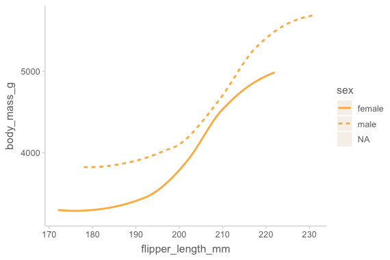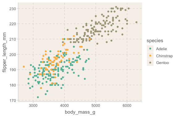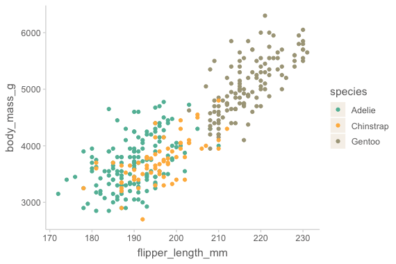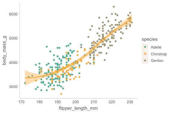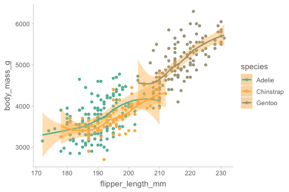 mapping = aes(x = flipper_length_mm, y = body_mass_g, color = species)