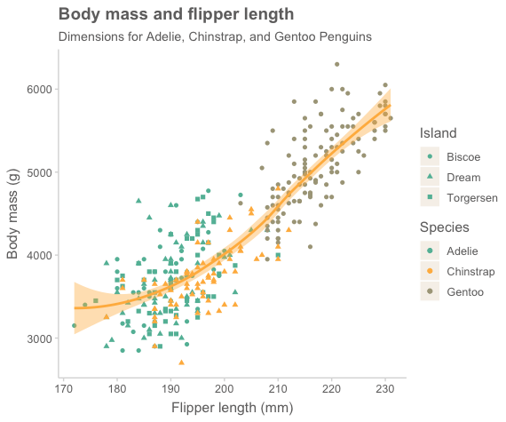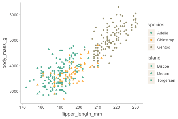 mapping = aes(x = flipper_length_mm, y = body_mass_g, color = species, shape = island)
