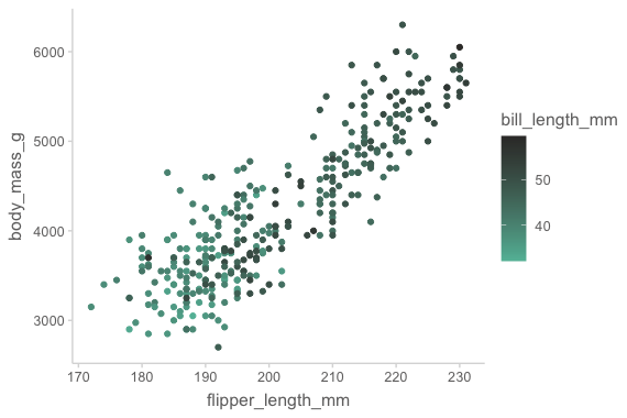 mapping = aes(x = flipper_length_mm, y = body_mass_g, color = bill_length_mm)