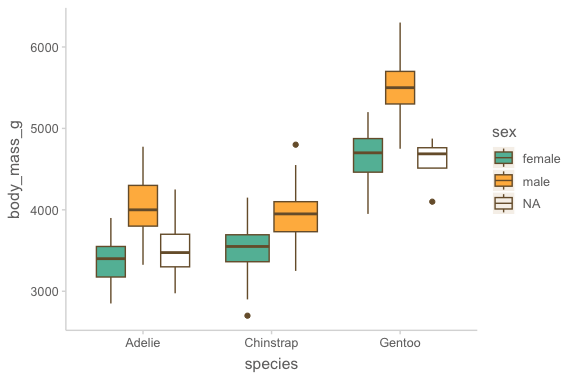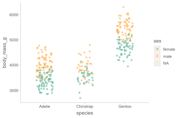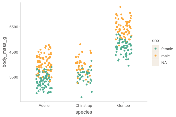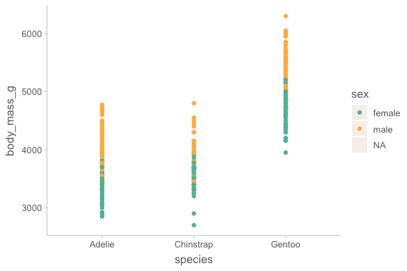 mapping = aes(x = species, y = body_mass_g, color = sex)