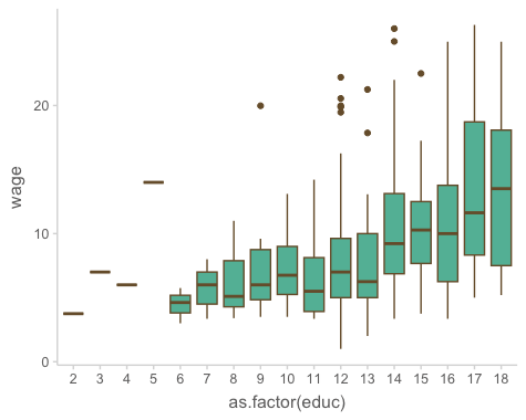 ggplot(aes(x = as.factor(educ), y = wage)) + # as.factor(): numeric을 factor로 변환