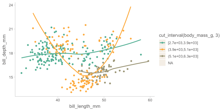 color = cut_interval(body_mass_g, 3) # body_mass_g의 값을 3개의 동일한 길이의 구간으로 나눔