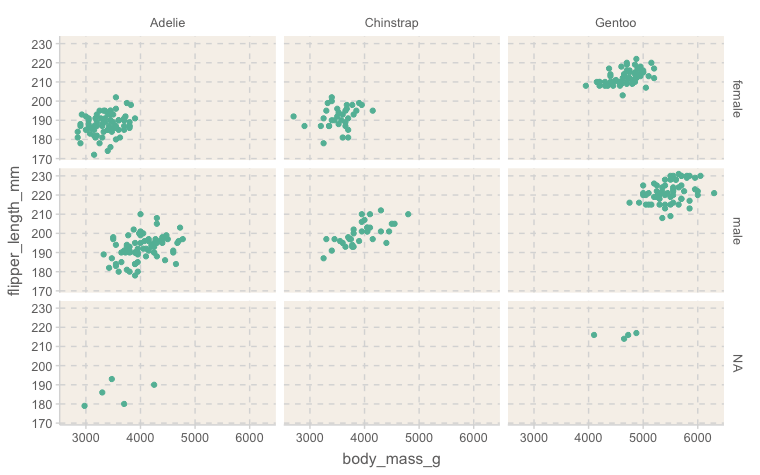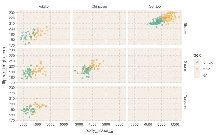 facet_grid(island ~ species) # 행과 열에 각각 sex, speciesWarning message: