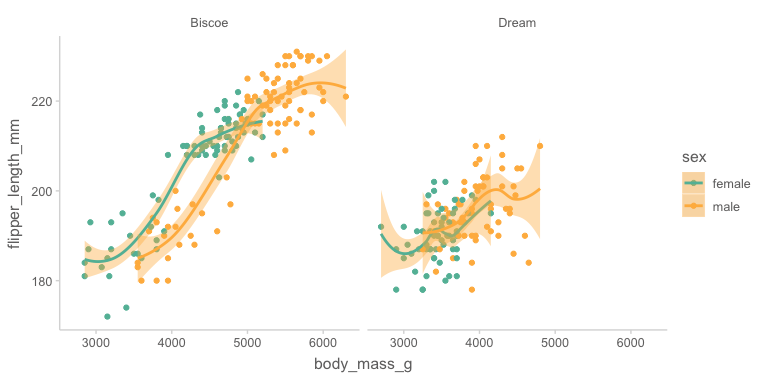 facet_wrap(~island)`geom_smooth()` using method = 'loess' and formula = 'y ~ x'