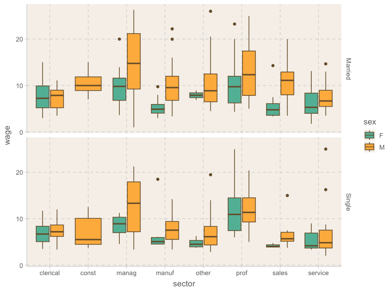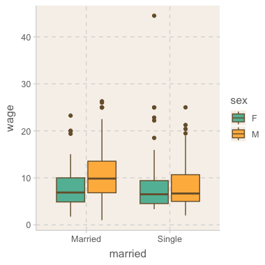 ggplot(aes(x = married, y = wage, fill = sex)) +