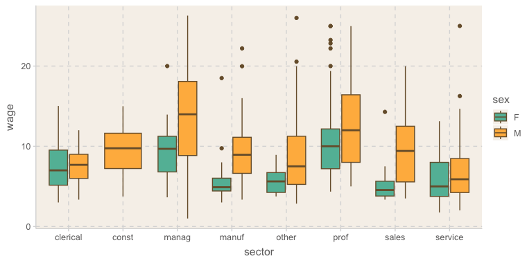 ggplot(aes(x = sector, y = wage, fill = sex)) +