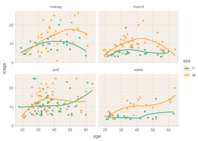 ggplot(aes(x = age, y = wage, color = sex)) +